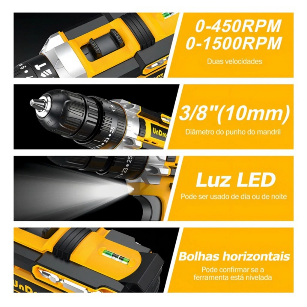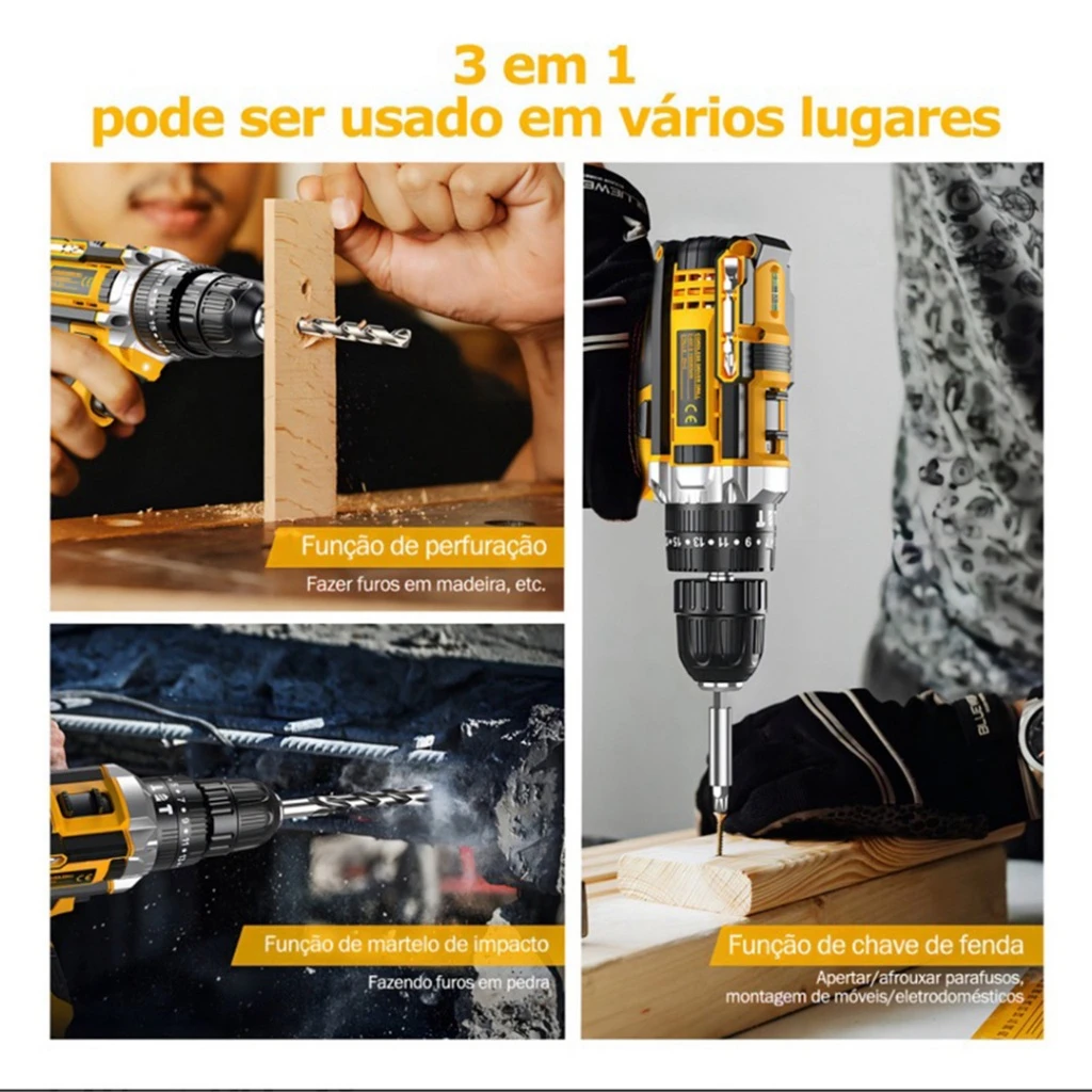 FURADEIRA PARAFUSADEIRA DE IMPACTO SEM FIO A BATERIA 21V/12V COM MALETA E ACESSÓRIOS**BATERIAS DAS FURADEIRAS DE 12 V E 21 V SÃO DIFERENTES**A furadeira a bateria de 21V ou 12V é uma ferramenta poderosa e versátil projetada para atender às necessidades de perfuração em diversos materiais.Com um design ergonômico e compacto, proporciona conforto durante o uso prolongado e facilita o manuseio em espaços restritos.VANTAGENS:- Facilidade de uso.- Versatilidade.- Durabilidade.- Eficiência.APLICAÇÕES:- Ideal para perfuração em diversos materiais, como metal, madeira e plástico.- Profissionais da construção, marcenaria, bricolagem e uso doméstico.ITENS INCLUSOS (FURADEIRA/PARAFUSADEIRA 21V):- 01 Parafusadeira Furadeira 21V- 01 Conector de broca de parafusadeira.- 01 Extensor Flexível.- 01 Carregador Bivolt.- 01 Conector de Bits.- 06 Bits de parafuso.- 09 Soquetes.- 02 Baterias. (BATERIAS EM FORMATO ACHATADO).- 06 Brocas.- 01 Maleta.ITENS INCLUSOS (FURADEIRA/PARAFUSADEIRA 12V):- 01 Parafusadeira Furadeira 12V- 01 Conector de broca de parafusadeira.- 01 Extensor Flexível.- 01 Carregador Bivolt.- 01 Conector de Bits.- 06 Bits de parafuso.- 09 Soquetes.- 02 Baterias (BATERIAS EM FORMATO DE CILINDRO).- 06 Brocas.- 01 Maleta.FICHA TÉCNICA:- Diâmetro do mandril 3/8” 10mm (aperto rápido).- Rotação sem carga : 0-400/0-1400 RPM.- Velocidade variável e reversível .- Indicador de carga de bateria .- Empunhadura Soft Grip.- Opção de torque 17 + 1.- Bateria de 1.300 mah.- Torque Max 32.N.M.- Voltagem: Bivolt- Bateria Extra.Peso: 1.250 KgDimensões Furadeira (CxLxA): 20 x 7 x 18 cmDimensões Caixa (CxLxA): 28 x 9 x 20 cm